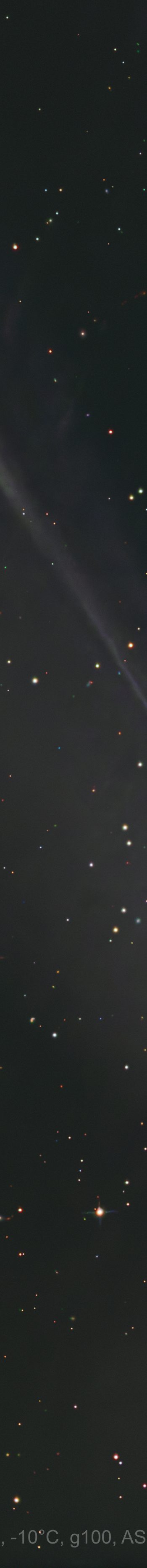 Vom Randes des Sonnensystems, der Oortschen Wolke, erreicht uns der helle Komet C/2024 E1 Wierzchos. Er zeigt sich mit zwei schmalen Gasschweifen und einem schwachen, breiten Staubschweif. Aber wir sehen noch einen zweiten Schweif, den Gegenschweif, hier nach unten links