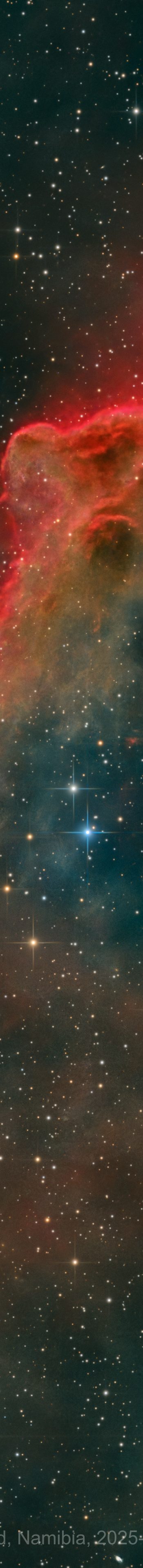 Im Sternbild Orion ist diese schöne Kombination der Dunkelwolke Barnard 35 und des sie einrahmenden, braun und rötlich leuchtenden Emissionsnebel LBN 878 zu sehen. Wie andere Dunkelnebel besteht Barnard 35 aus interstellarem Gas und Staub, das das Licht der dahinterliegenden