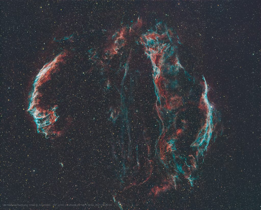 Diese Cirruswolken ähnlichen Nebel sind die letzten sichtbaren Reste eines Sterns, der vor etwa 8000 Jahren in der Milchstraße explodierte. Für Menschen, die zu jener Zeit lebten, war die sich ausdehnende Wolke so hell wie eine Mondsichel und für mehrere Wochen zu sehen. Die Nebel befinden sich im Sternbild Schwan. Obwohl sie auch bei uns hoch am Nachthimmel stehen, habe ich die beiden Detailaufnahmen vom östlichen und westlichen Nebel bei besserem Himmel in Namibia gemacht.