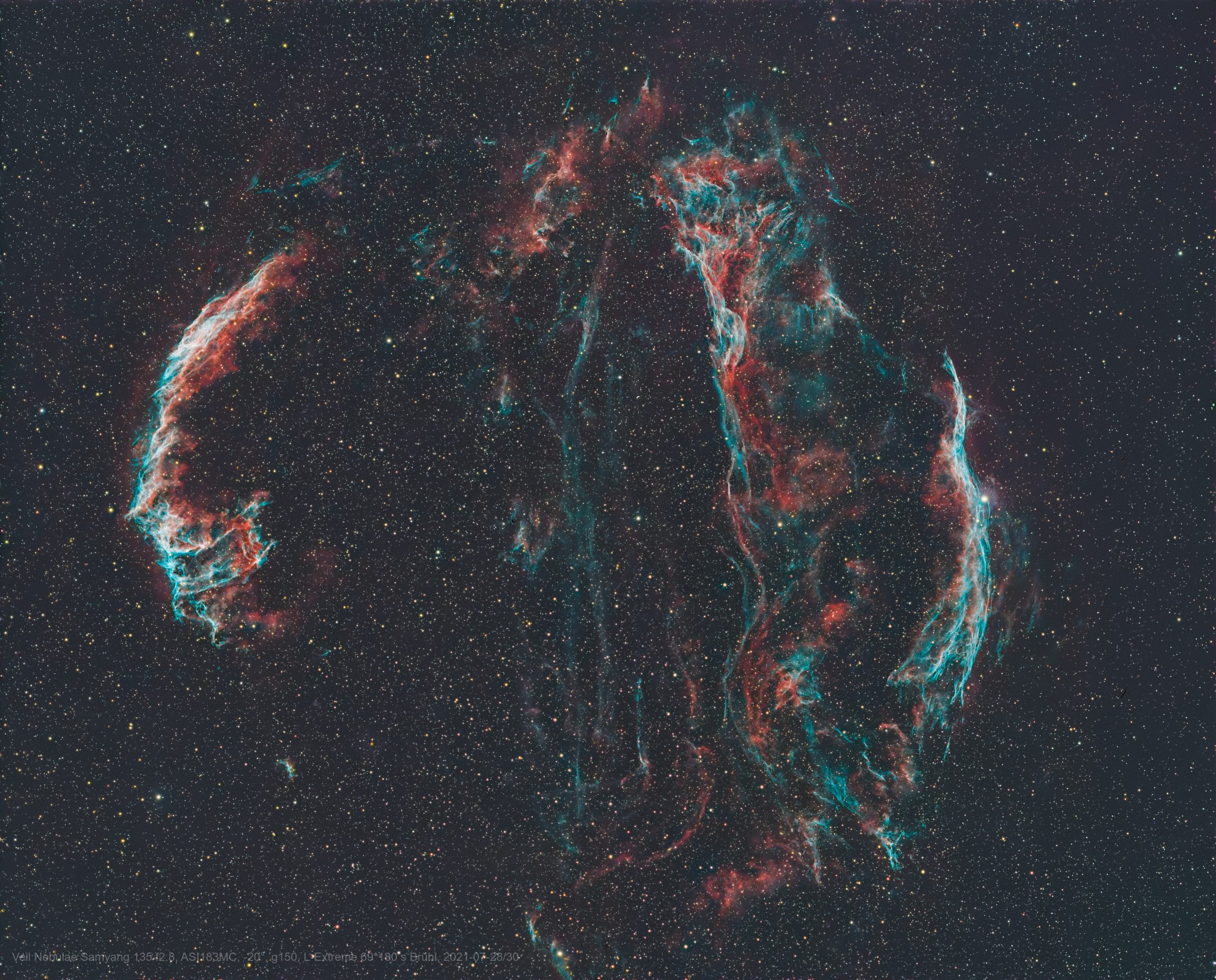These cirrus cloud-like nebulae are the last visible remnants of a star that exploded in the Milky Way about 8,000 years ago. For people living at that time the expanding cloud was as bright as a crescent moon and visible for several weeks. Both nebulae are located in the constellation Cygnus. Although they are also high in our night sky, I took the two detailed photos in Namibia where the sky is more favourable.