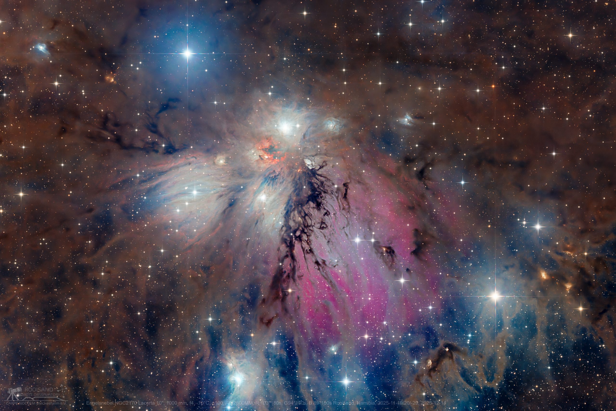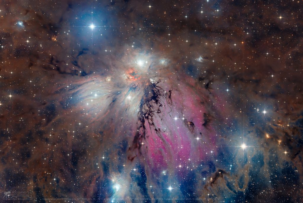 Mein farbenprächtiges Foto zeigt den Engelnebel im Sternbild Einhorn. Ein Nebelkomplex, der eine Mischung schönster verschiedener Nebeltypen vereint. Bläuliche Nebel, die das Licht nahegelegener heißer Sterne reflektieren. Wasserstoffwolken, die durch UV-Licht nahegelegener Sterne angeregt werden und so rötlich leuchten. Dunkle Absorptionsnebel, die nur als Silhouette zu sehen sind, da sie dahinter liegendes Licht blockieren. All diese Nebel liegen am Rand einer riesigen Molekülwolke, die schätzungsweise nur etwa 2.700 Lichtjahre von uns entfernt ist.
