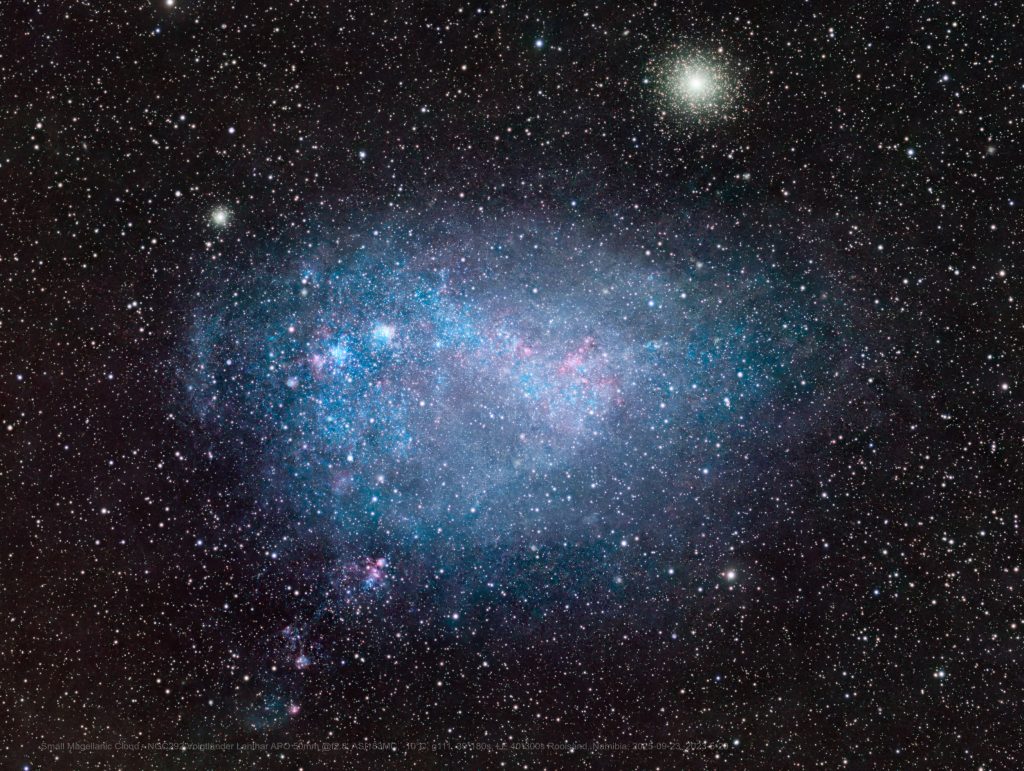 Andrea Corsali hatte 1515 als erster Europäer die Magellanschen Wolke beschrieben, größere Bekanntheit erlangte sie jedoch durch die Beschreibung der Weltumsegelung von Ferdinand Magellan 6 Jahre später. Wie die Große Magellansche Wolke ist die Kleine kein Nebel, sondern eine Galaxie in unserer Nachbarschaft. Die Sternverteilung in der Kleinen Magellanschen Wolke deutet auf Interaktionen mit der Großen Magellanschen Wolke hin. Tatsächlich verbindet beide untereinander, aber auch mit unsere Milchstraße eine Band aus Wasserstoff. Die Kleine Magellansche Wolke hat eine scheinbare Größe von etwa 7 Monden.