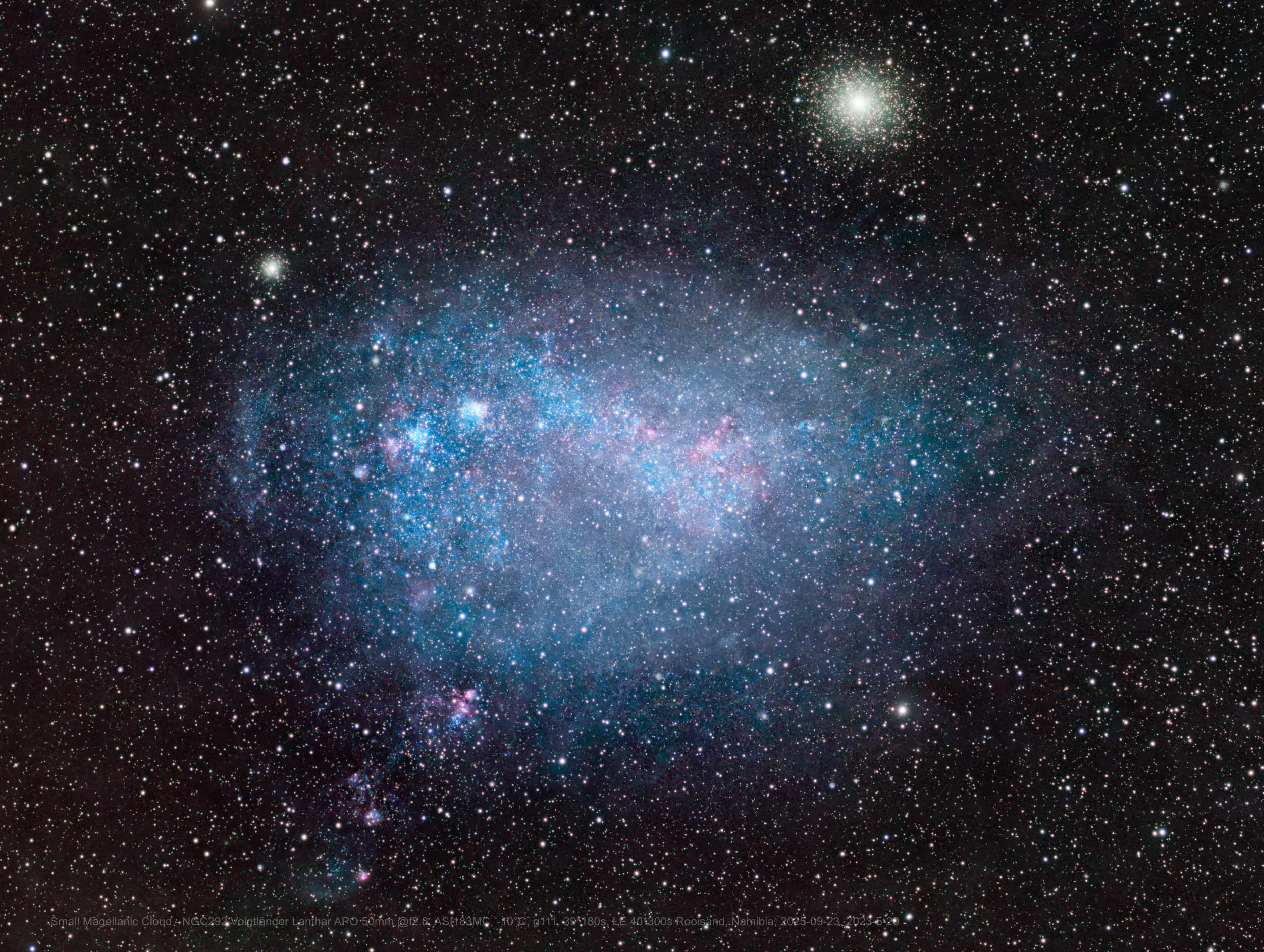 Im unteren Teil des Bildes sind zwei Kugelsternhaufen zu sehen. Der Linke ist 47 Tucanae, der zweithellste Kugelsternhaufen am Himmel.